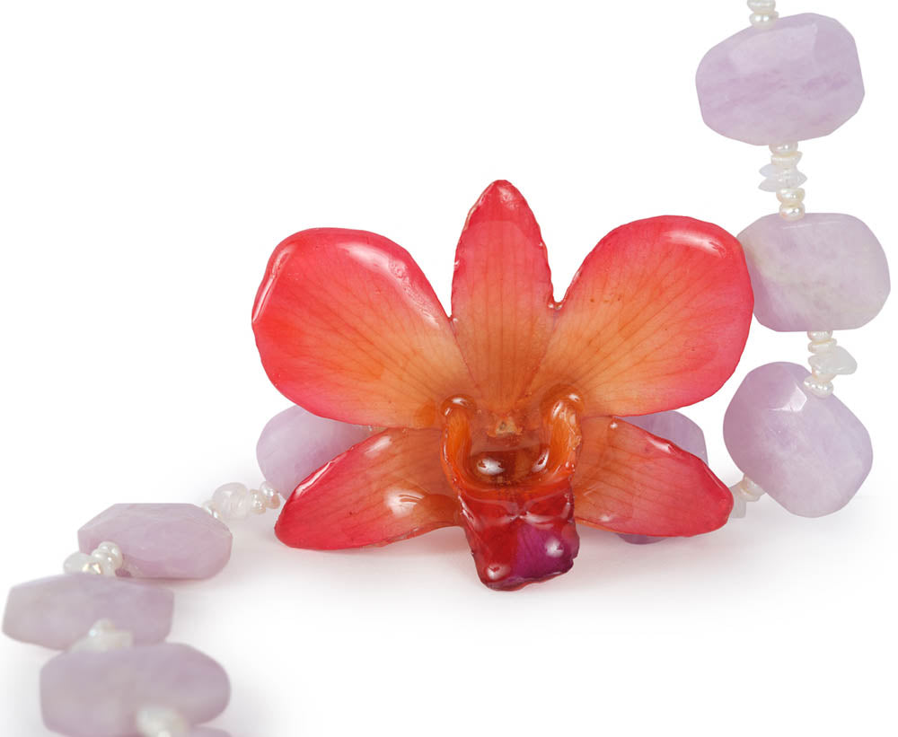 Ambar Kunzite and Pearl Real Orchid Tropical Necklace